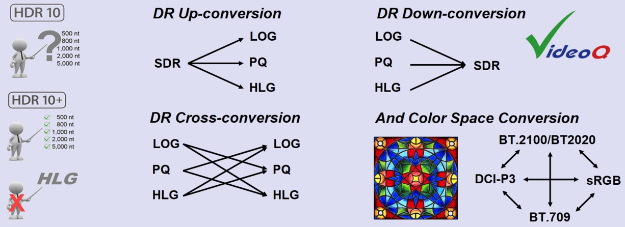 Mixed HDR / SDR environment requires software and hardware engines for verification, auto-enhancement , up-, down-, and cross- conversion within and/or between all HDR / SDR formats and color spaces .