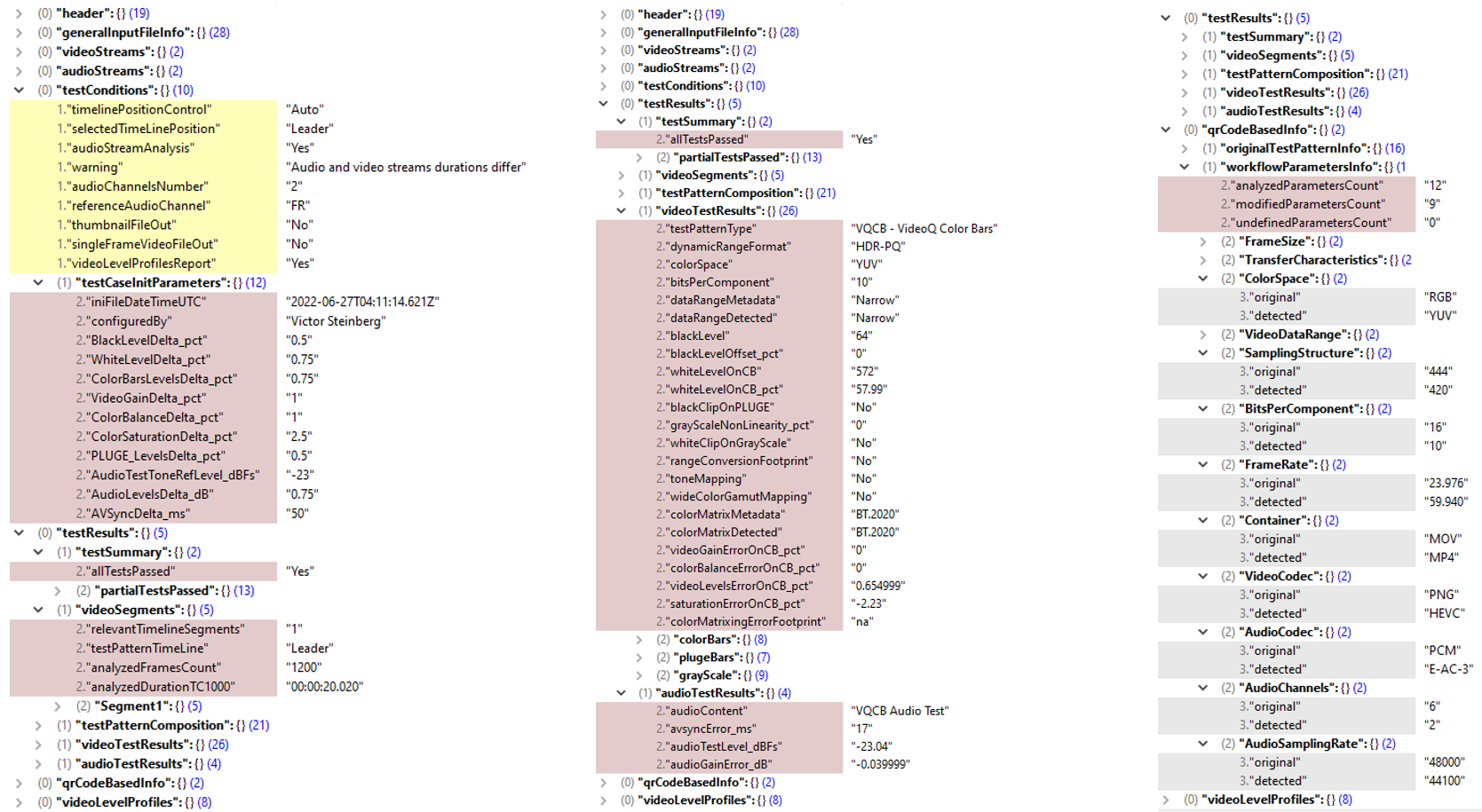 It reads media file YUV/RGB data, detects the relevant segments of video timeline, auto-detects test pattern type, calculates video and audio content parameters, compares them with file metadata and user-defined tolerances, checks the workflow distortions and conversion footprints,